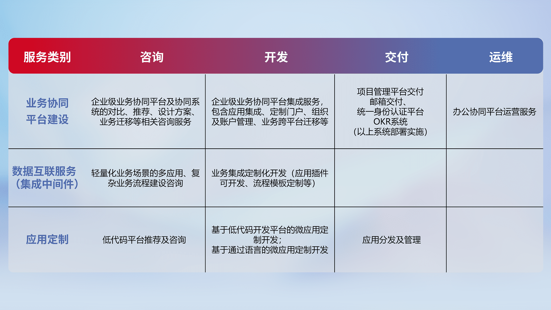 针对钉钉、、企微、、IDaas等平台级产品提供产品的规划、、、、方案、、、、交付、、定制化开发等服务,,实现如统一协同办公、、、智能客户服务、、、、混合会议管理、、、智能数据查询、、、等业务场景,,,,实现数字化转型。。