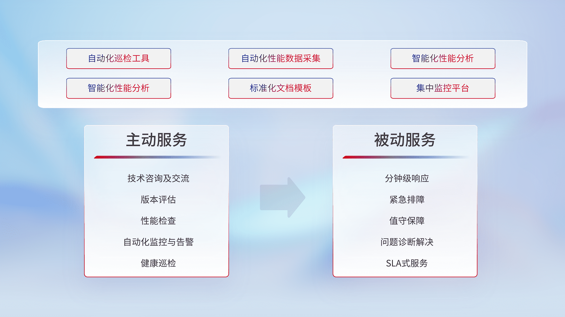 智能化工具和标准化文档,,,保障服务质量,,,提供主动服务(包含技术咨询、、版本评估、、、、性能检查、、自动化监控与告警、、、健康巡检)和被动服务包含(分钟级响应、、紧急排障、、值守保障、、、问题诊断解决、、、SLA服务)。。。